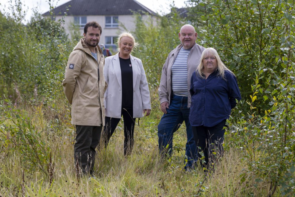 Chair and Depute Chair of South Lanarkshire Council’s Housing and Technical Resources Committee, Councillors Davie McLachlan and Margaret Cowie, visited the Rutherglen site with Josh Littlejohn MBE, Founder of Social Bite, and Karen Good, Contract Manager at The Salvation Army, to mark the start of the work which will transform the unused land into a village of safe, sustainable homes for people affected by homelessness.